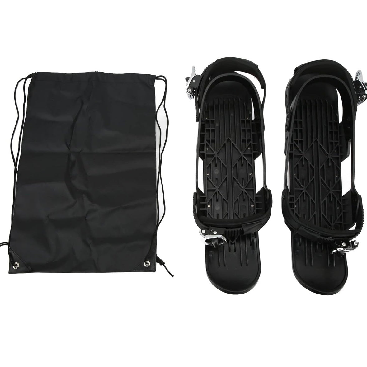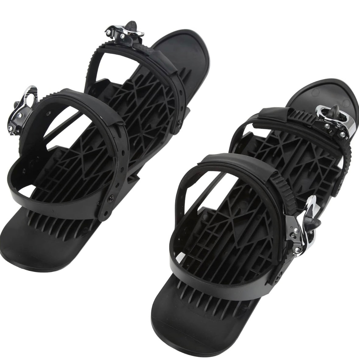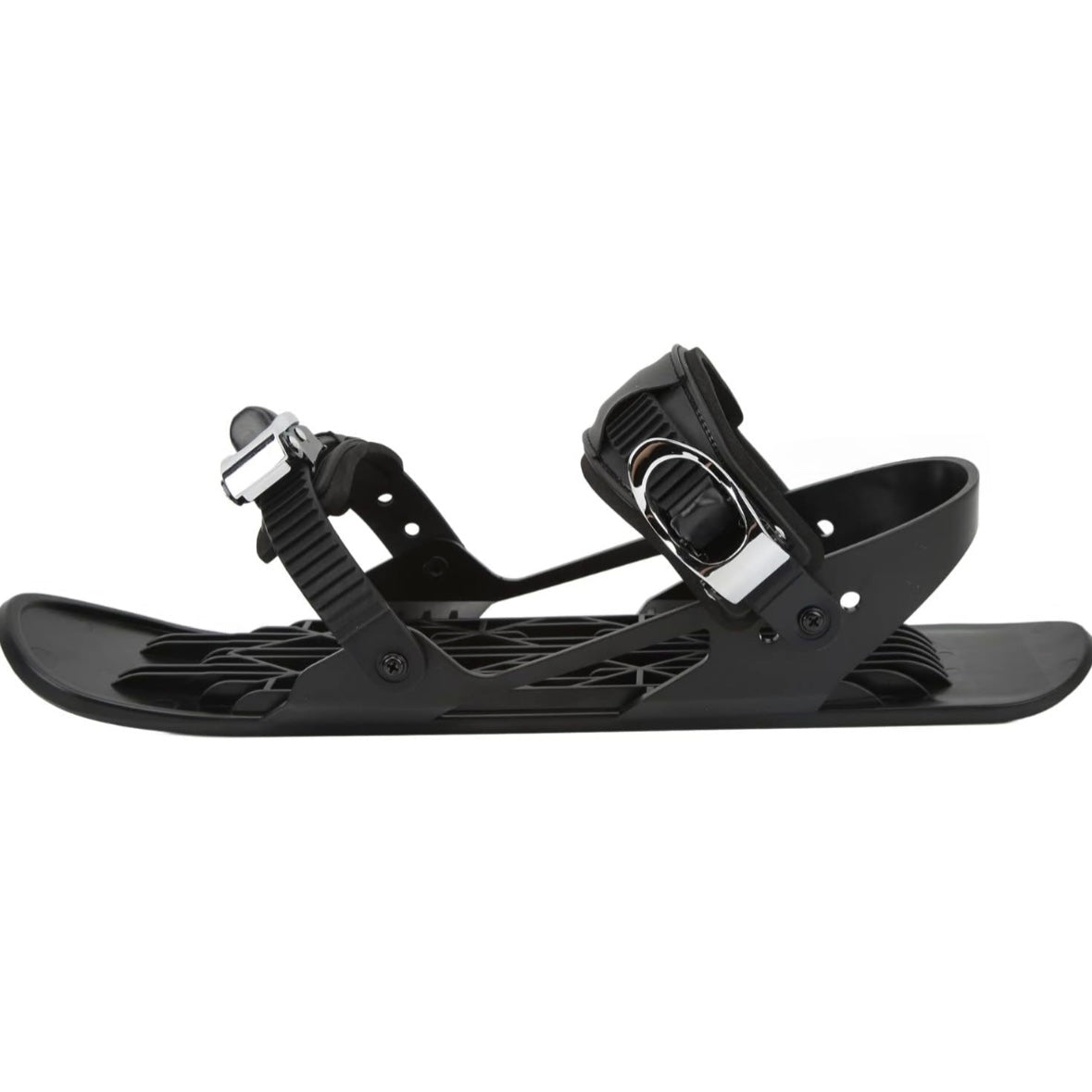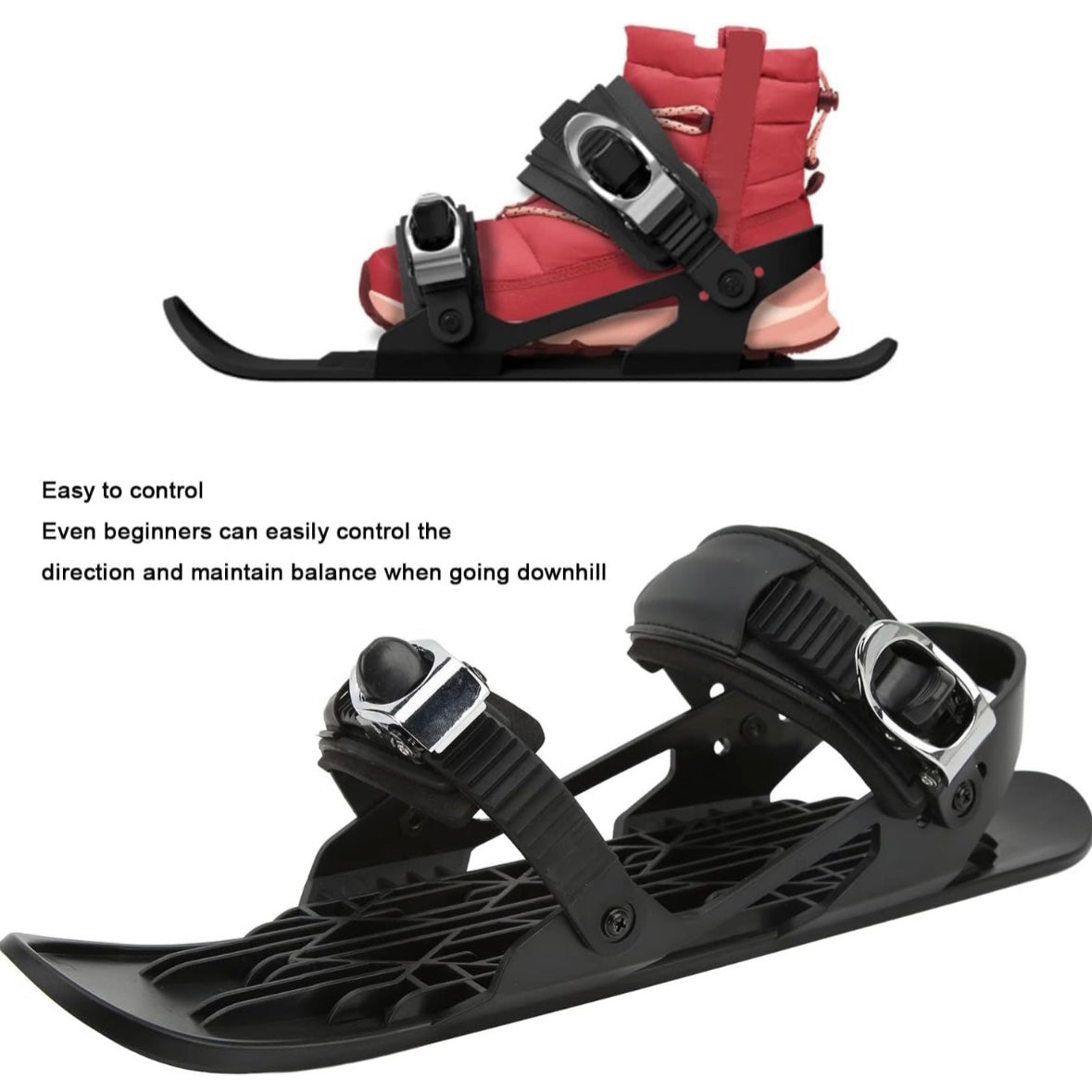 Mini Skis are made of highly durable and lightweight fibreglass reinforced material. Metal ski edges enable easy stopping. Heel brake lets you slow down. Adjustable bindings let you attach Snowfeet to any shoe.