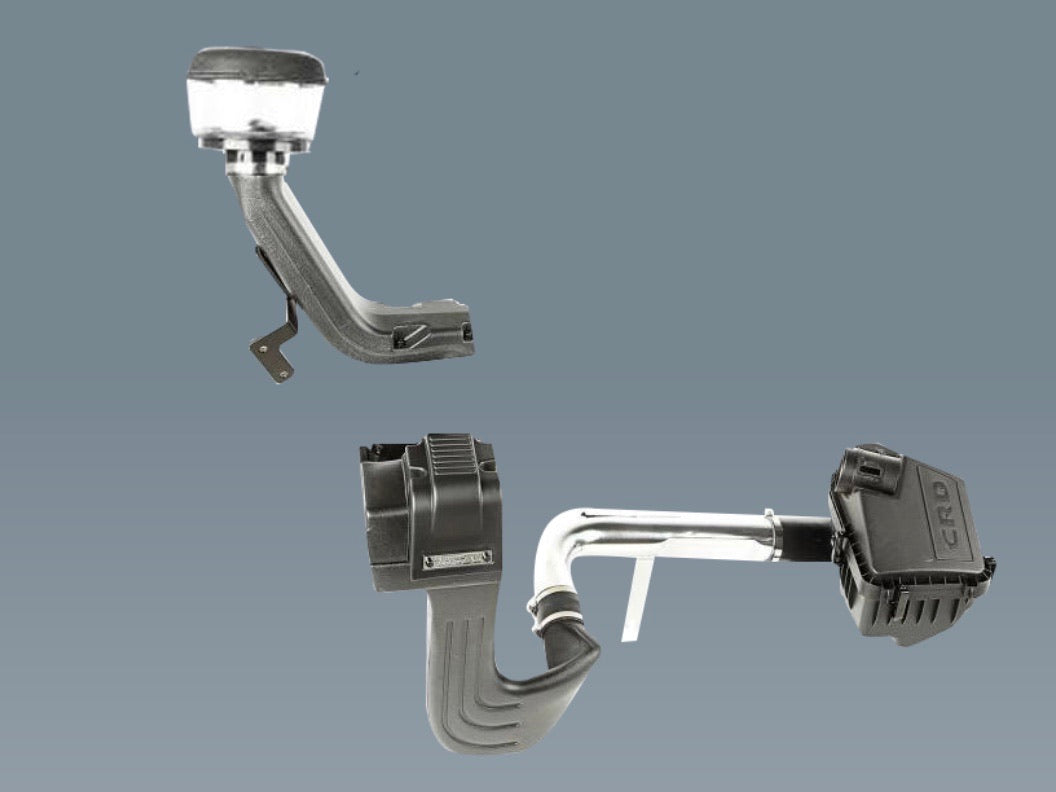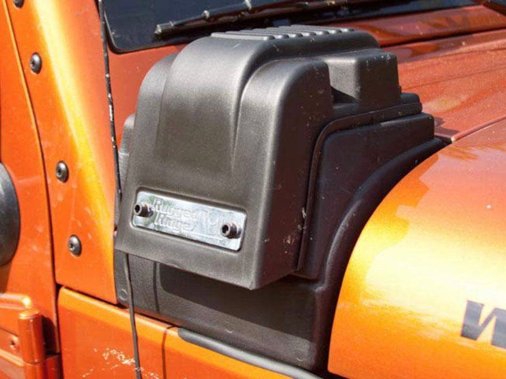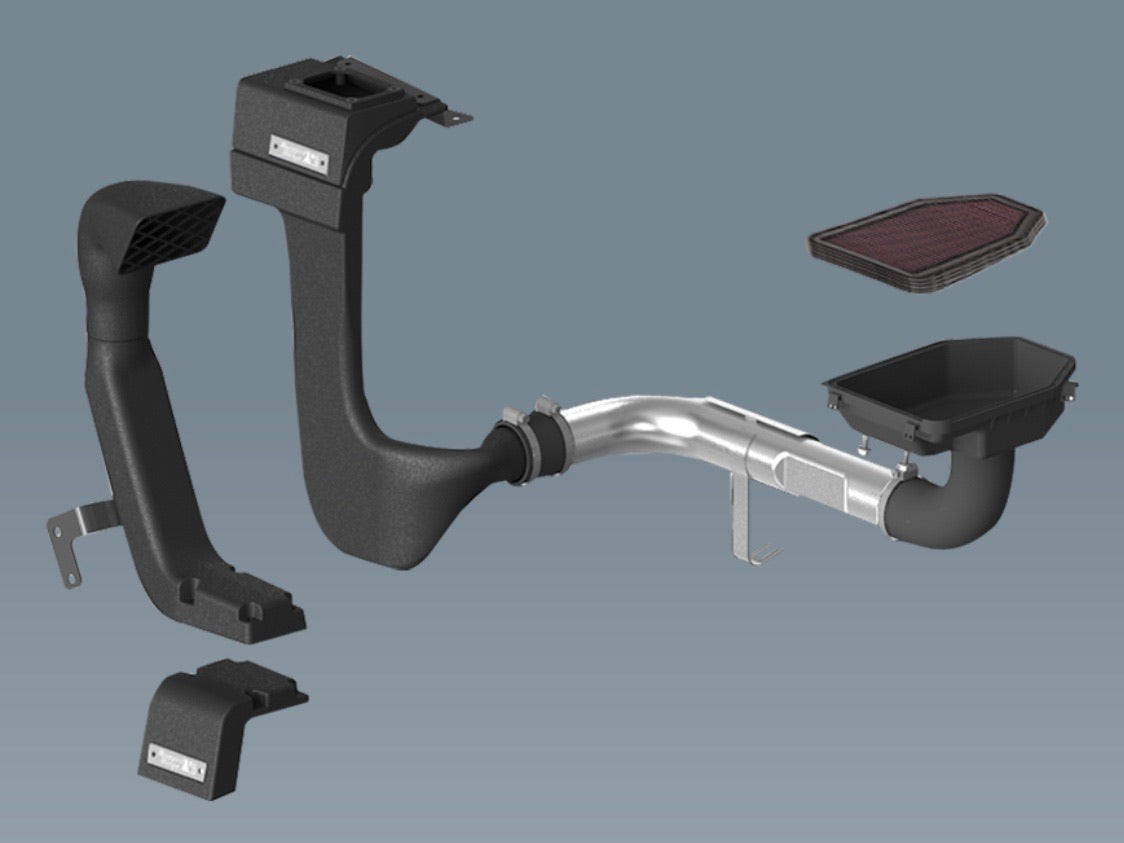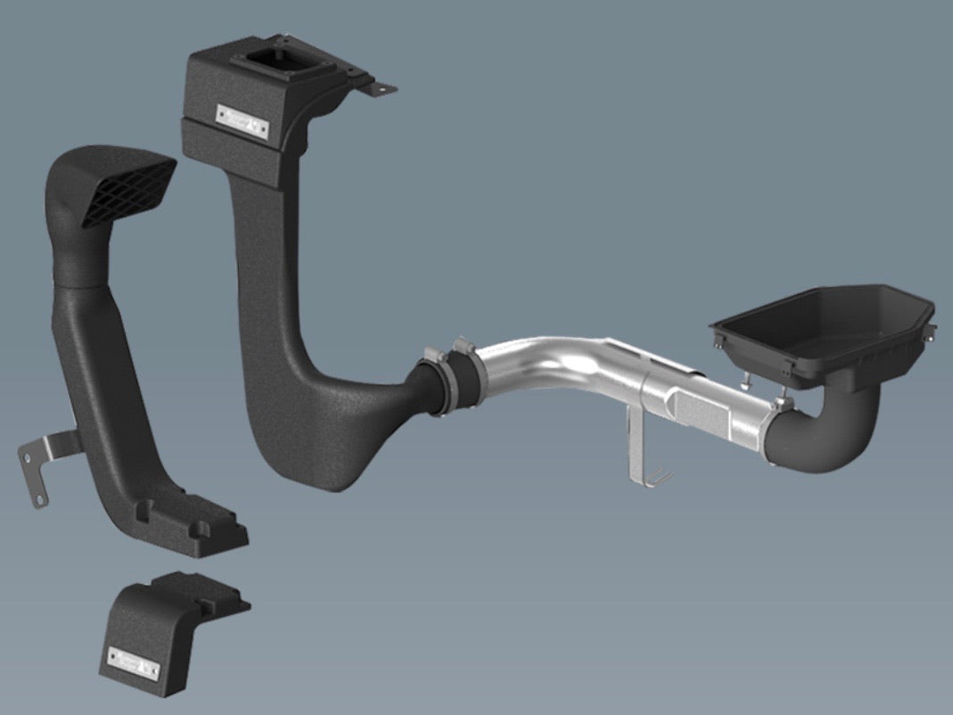 The new modular XHD Snorkel System from Rugged Ridge® relocates the stock air intake to help reduce dust clogged filters and the risk of hydro-locking your engine. The snorkel comes standard with the Pre-filter Low Mount which relocates the air intake just below the windshield. The optional High Mount Ram intake features an additional 21” to the top of the windshield. This kit works with all aftermarket fender flares, most light bars and roof racks.