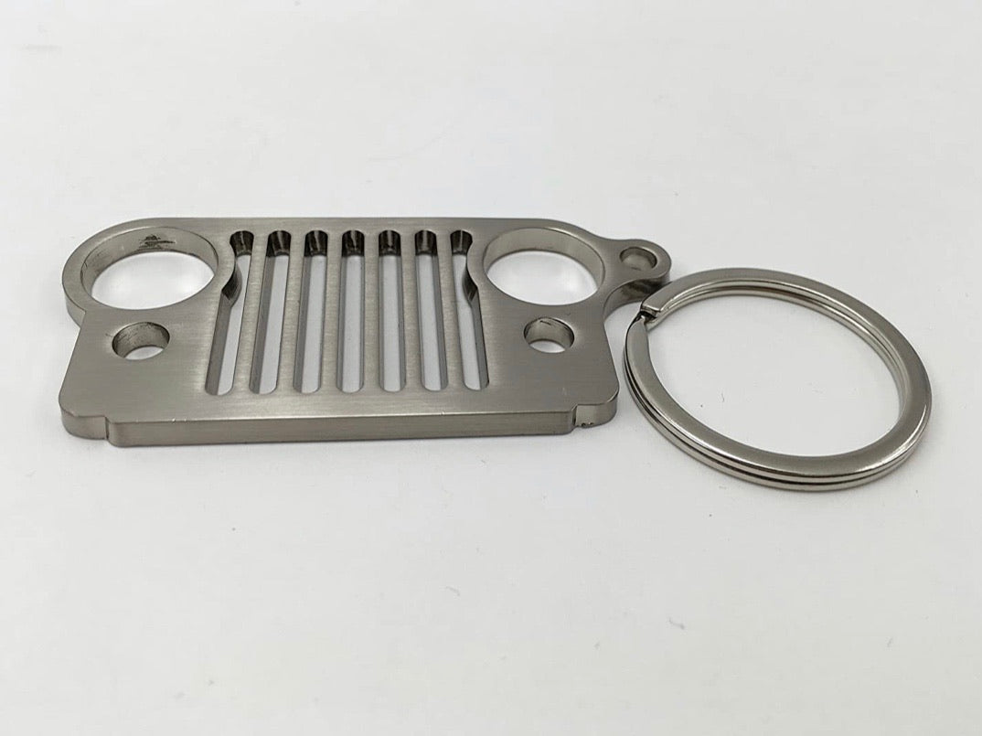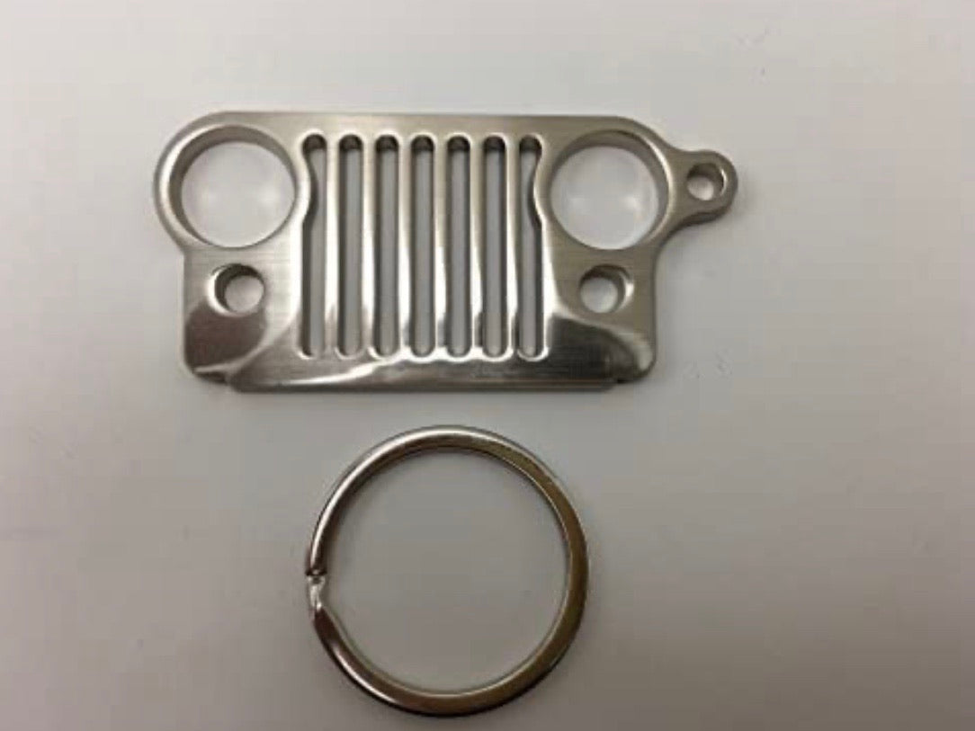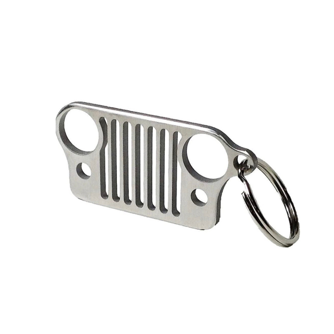 Jeep Logo Keychain. Show pride in what you drive with this Jeep logo key chain from Alterum. The bold white logo with black border is sure to catch eyes, and to ensure that you grab the right set of keys when it's time to hit the road or the trails!