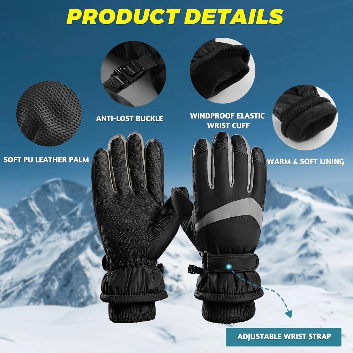 - CONSIDERATE DESIGN - The winter ski gloves with non-slip soft PU leather patch palm can provide your hands good grip. And the elastic cuff closure keeps the gloves tight to your hands and is effectively preventing against water and snow outside. The anti-lost buckle can help you find two gloves quickly. These convenient designs allow you to feel endless warmth while working in winter.